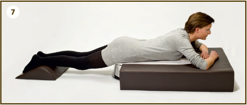 Лягайте на живіт (від реберної дуги до нижньої частини живота) на Шуман 3D-плату, руки розташуйте перед собою, тіло повністю випрямлене. Упріться передпліччям в U-подібну подушку і повільно підніміть верхню частину тулуба від плати, голову тримайте прямо. Підколінна подушка, підкладена під ноги, забезпечить зручну позу. Контролюйте дихання, зосередьтеся на почутті розслабленості та легкості.